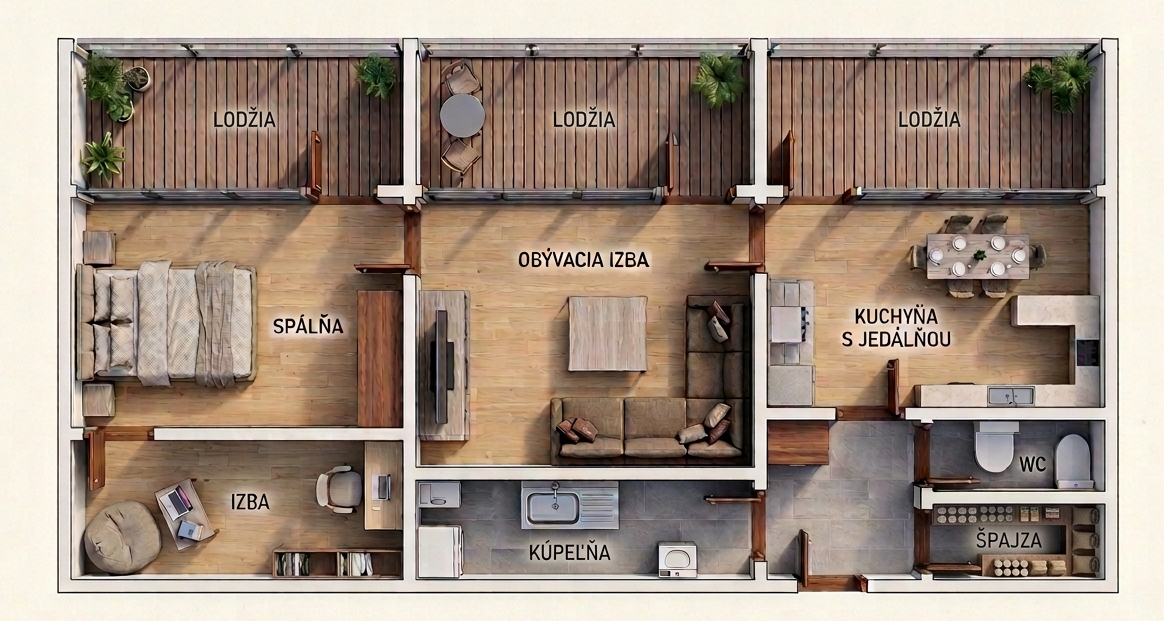 UNIKÁTNA DISPOZÍCIA: Byt má výmeru 66 m2 a disponuje až troma lodžiami. Každá obytná miestnosť má svoj vlastný výstup na lodžiu – na sídlisku ide o absolútnu raritu!